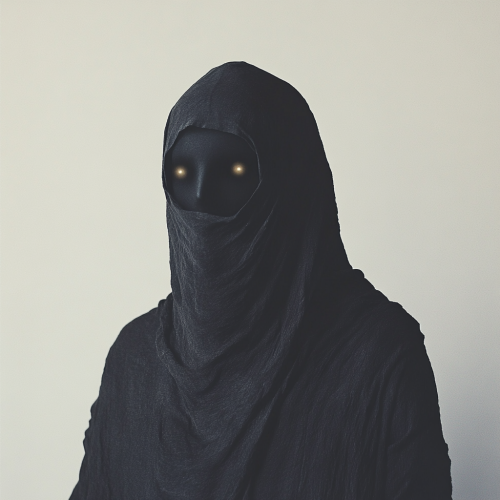 close up portrait of A shadowy hooded figure with minimal details, entirely covered in darkness, standing against a plain white background. The face is hidden, with only glowing eyes visible, creating an aura of mystery and secrecy. --v 6.1