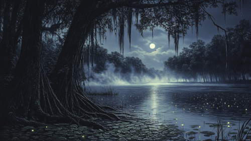 nighttime view from the edge of a marshy jungle, looking out over a calm, dark expanse of water. Dense trees and vines frame the shore, their twisted roots and shadows stretching into the still water. Wisps of mist hover above the water’s surface, where clusters of floating vegetation drift quietly. Fireflies and faint moonlight illuminate the scene, casting a pale glow over the calm, eerie landscape. Emerging from the water, at a distance but fully focused on the viewer, is a figure’s head just above the surface. Only their eyes and a hint of their face are visible, glowing with an unnatural, captivating light, staring directly at the viewer with an unsettling intensity, --ar 16:9