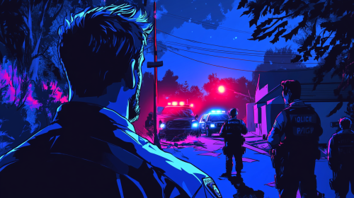 Create a chilling cartoon-style illustration depicting a sinister figure observing a crime scene from the shadows, blending in with the darkness. The character has an expression of satisfaction and cunning, watching as other police officers arrive, unaware of his true nature. The background features a chaotic crime scene with flashing police lights, scattered evidence, and the confusion of officers trying to piece together the puzzle. Emphasize the eerie tension in the atmosphere, using dark tones of blue and gray contrasted with the harsh red of the emergency lights. Include subtle hints of deception, such as a false clue left behind, to evoke a sense of foreboding and manipulation. --ar 16:9