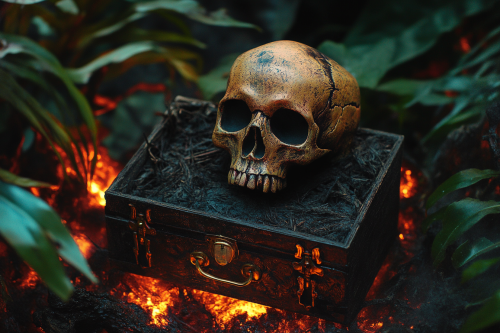 An ancient box filled with sounds. The scene is set in a glowing, magical forest, with contrasting vibrant greenery and charred ground, giving the skull a wild yet enchanting presence dramatic lighting. --ar 3:2