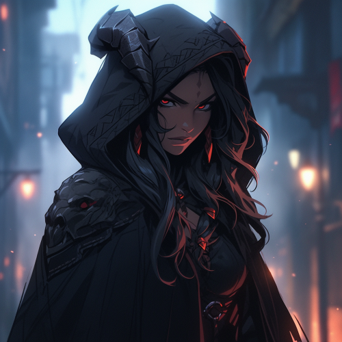 a mysterious female tiefling assasin, in dark clothes with feathered accents, standing in dim light. Her gaze is intense, with piercing eyes and a subtle smirk, exuding confidence and secrecy. She holds a sleek black dagger with a feathered hilt, dungeons and dragon character design, realistic, hyper detailed, fine details, graphic novel style, portrait, hard lines, accurate hands, hyper detailed eyes, cinematic beautiful lighting, depth of field --stylize 250 --niji 5