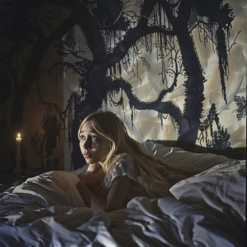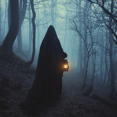 hi Resolution cinematic photo of an enigmatic woman draped in a flowing black cloak, her silhouette hauntingly framed against the murky backdrop of fog-laden woods. In her grasp, she clutches a lantern emitting a dim, otherworldly glow. The winding path beneath her feet twists through the eerie forest, the gnarled trees reaching towards the heavens, their branches casting elongated shadows that dance in the ghostly fog. The ambiance is one of mystery and suspense, as if the woman is a spectral guide navigating the ethereal realms of the haunting, dim-lit woods. --v 6.0