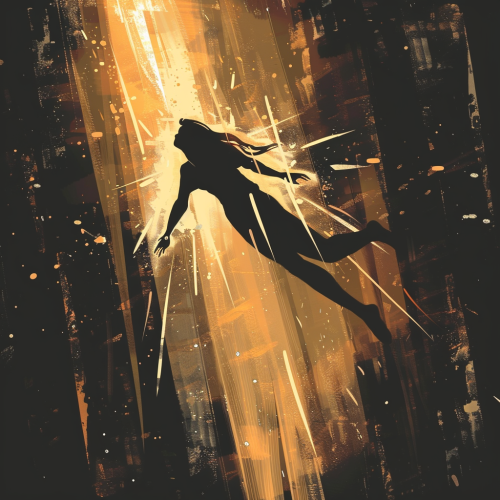 an illustration in the style of Fiona staples of beams of light spearing through the silhouette of a woman who is gracefully falling backwards