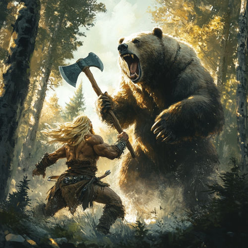 in the style of das schwarze auge, a blonde barbarian with a two-handed axe runs towards an angry big bear on its hind legs, light forest in the background