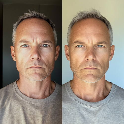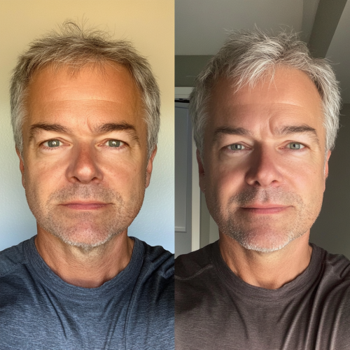 man, 50 years old, us citizen, white skin color, 2 versions of him, one that looks extremely tired and has eye bags, low energy head and can barely look in the camera, image has also less lightning, pale skin and the other one is the same man but looks extremely healthy, fully energized, smiling. Image taken with iphone 14