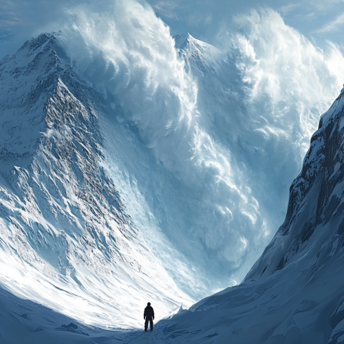 a person standing in the route of an avalanche coming down a mountain . The avalanche is big and powerful and makes the person look tiny standing in its wake.