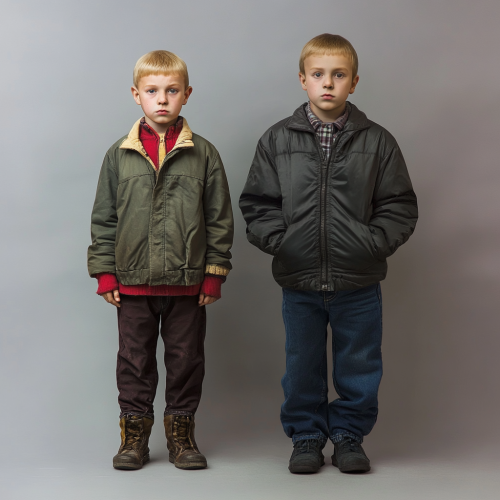 A realistic full-body photo of two boys standing next to each other. One boy is 6 years old and shorter, and the other is 9 years old and taller. Both boys are dressed in clothing from the Soviet era. Each boy has the face of Vladimir Putin, but they should still look like children in terms of body size and posture. The scene should be highly realistic, with a clear height difference between the two boys.