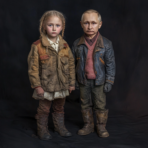 A realistic full-body photo of two children standing next to each other, one is 6 years old and the other is 9 years old. Both children are dressed in clothing typical of the Soviet era. Each child has the face of Vladimir Putin, hd, 8k