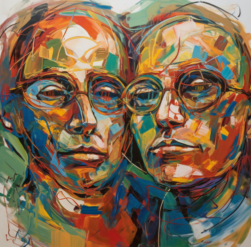 An abstract expressionist painting of two faces, one with glasses and the other without, intertwined in an artistic composition. The colors are bold and dynamic, creating a sense of movement and energy. Abstract lines add depth to the artwork, while the background is minimalistic for maximum focus on the characters. The painting is in the style of an abstract expressionist artist. --ar 117:116 --v 5.0 --s 750