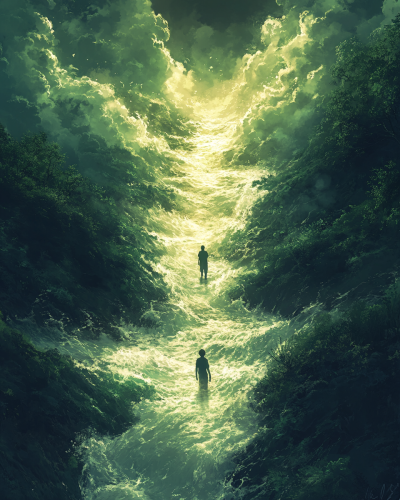 A serene, flowing river that splits into two paths, each leading to a person standing on either side of the river. The river visually connects the two individuals, symbolizing their shared essence or connection. Both figures could be standing with a hand gently touching the water, as if feeling the flow that binds them together. The surroundings could be lush, green, and peaceful, reflecting the harmony and unity between the two, in anime art style --ar 4:5 --s 750