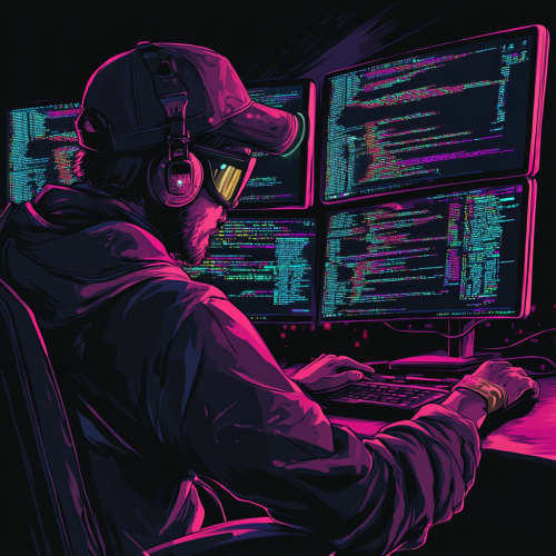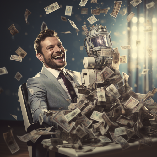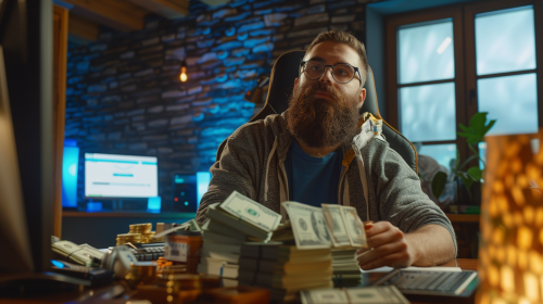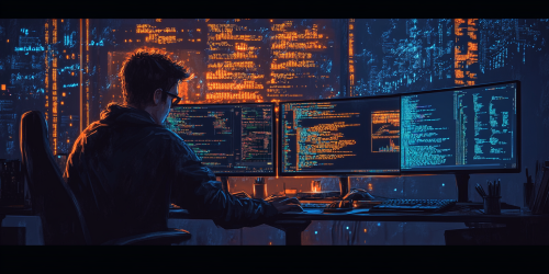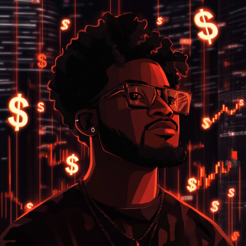 Generate a digital art for A digital art scene showing a professional coder surrounded by floating dollar signs and upward-trending graphs, symbolizing high demand and lucrative salaries. Use black as the primary color. --ar 1:1