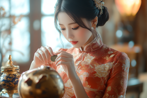 Realistic photo of a wealthy 30-year-old Japanese woman, wearing a stylish and expensive dress, placing a coin into a piggy bank, set indoors with a lavish, high-end atmosphere, her expression is both focused and relaxed. Photorealistic, realistic image, 8K resolution --ar 3:2 --v 6.1 --style raw