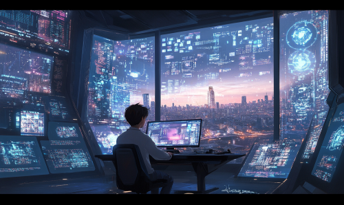 Generate a digital art for A digital art scene showing a young coder sitting at a desk surrounded by holographic screens displaying various data structures and algorithms. The background is a futuristic room with a large window showing a cityscape at dusk. The color palette includes shades of #0D2B52, with glowing elements in white and light blue to emphasize the digital environment. --ar 5:3