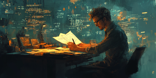 Generate a digital art for A digital art scene showing a determined coder at a desk cluttered with papers and code snippets, symbolizing the brute force approach. The background is a deep #0D2B52 color, with a soft light illuminating the coder's focused expression. The scene should convey the idea of starting from scratch and working through complex problems. --ar 2:1