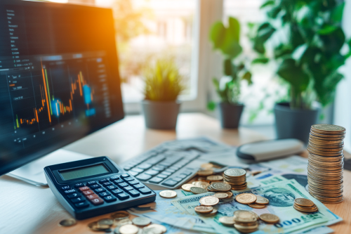 Realistic photo of a sleek desktop with a calculator and scattered coins alongside organized banknotes, subtly representing thoughtful financial planning for future uncertainties, in a minimalist and modern setting. Photorealistic, realistic image, 8K resolution --ar 3:2 --v 6.1 --style raw