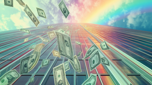 a futuristics office building. all windows are open and enormous amounts of cash flows out from them. view from the ground level upwards. a rainbow in the sky. --ar 16:9