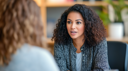 Close-up of two executives from diverse backgrounds in a thoughtful conversation in a minimalist office, positive conversation, professional talking at a desk. shot with a Nikon Z9 and 35mm lens at a slight angle. Lighting is balanced and natural, with decor in colors #614658 (plum) and #D9CCC4 (soft beige). The scene reflects professionalism, confidence, and inclusion. --ar 16:9 --v 6.1
