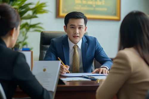 Create a professional scene inside a modern office in Thailand. The image should feature a notary public at their desk, attentively reviewing and signing official documents. The office should have subtle Thai elements, like traditional decorations or cultural symbols, to reflect the location. Include clients sitting across from the notary, engaged in the process. The overall atmosphere should convey trust, professionalism, and the importance of notary public services --ar 3:2 --v 6.1