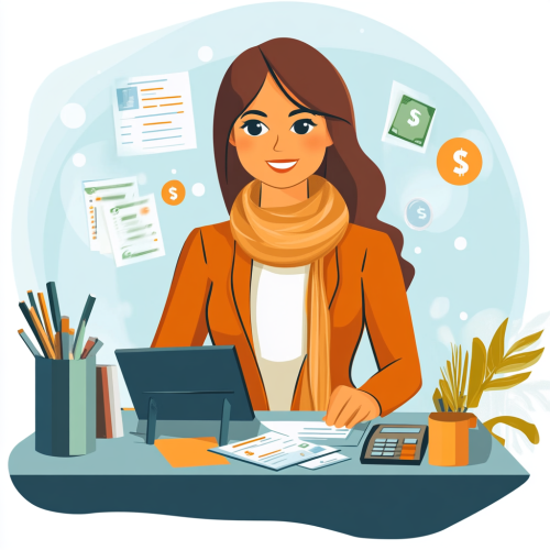 a woman with scarf in the office behind her desk and working as a financial manager. the symbole and icons of money and trading are in the picture with bright colors