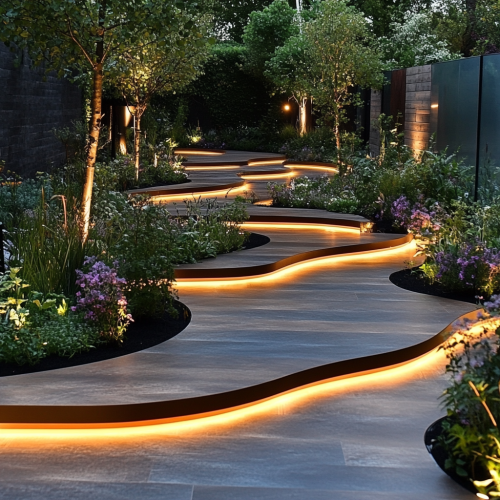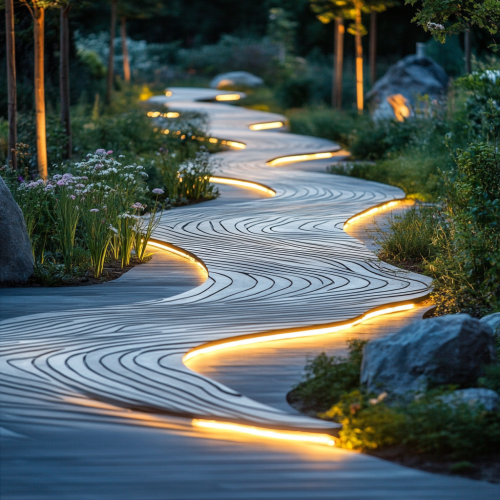 A Stage with Wavy Garden Path and Lights