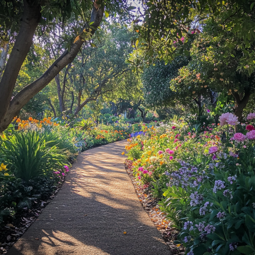 A night garden illuminated by soft, warm lights, with glowing pathways and trees draped in fairy lights, creating a magical and inviting atmosphere. Taken with an iphone 15 pro