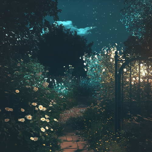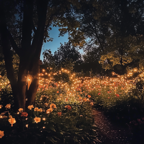 A nighttime garden scene with soft, warm lights highlighting the flowers and trees, creating a magical, inviting atmosphere under the starry sky taken with an iphone 15 pro