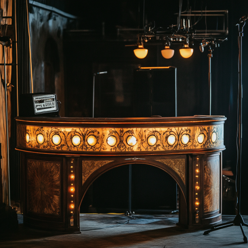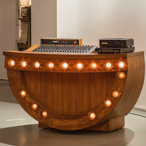 a semicircular wooden piece of furniture one meter and twenty centimeters high. decorated with vintage style inlaid lights with a mixing desk on top like a beautiful melancholy DJ booth set in the middle of a music stage