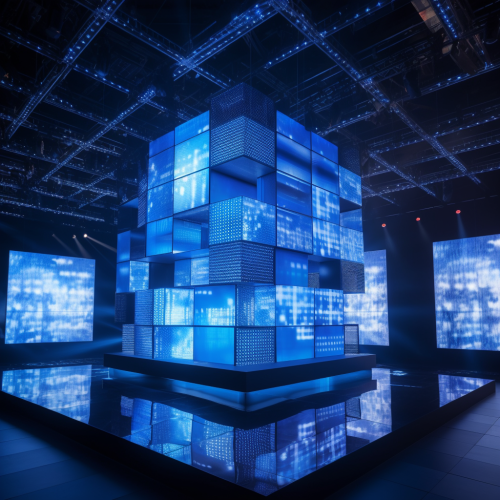 cube-shaped stage with screens and blue LED lights, at a marketing event, ultra HD, hyperrealistic, --ar 1:1 --v 5.0