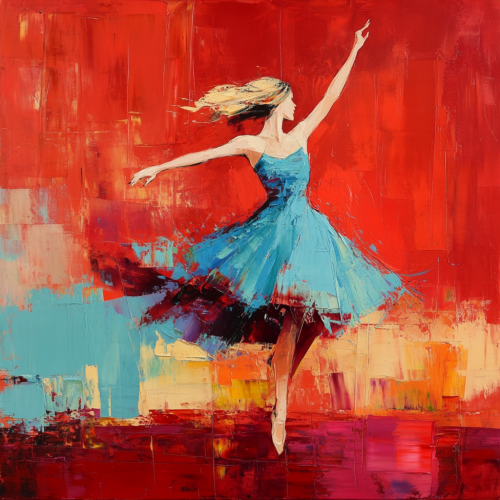 A vibrant, abstract painting of a woman dancing in a modern style, set against a rich red background. Her movements are fluid and expressive, capturing a sense of freedom and passion. Subtle blue highlights touch her figure, creating contrast and depth against the red tones. The style is impressionistic with broad, textured brushstrokes, capturing the energy of dance and the emotional intensity of the colors. The scene is minimalist, focused on the dancer and her movements, with no background distractions.