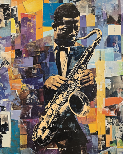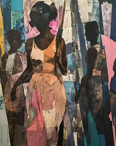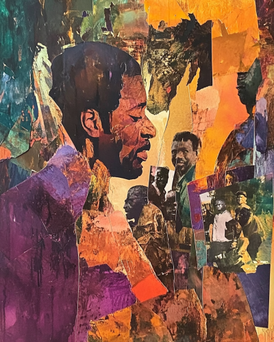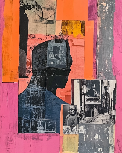 a vintage simple collage painting from Romare Bearden, a painting of Gordon Parks photos, it is for a poster for tourists, naturally rich hues with subdued tones, it must evoke deep emotion and social commentary --ar 4:5