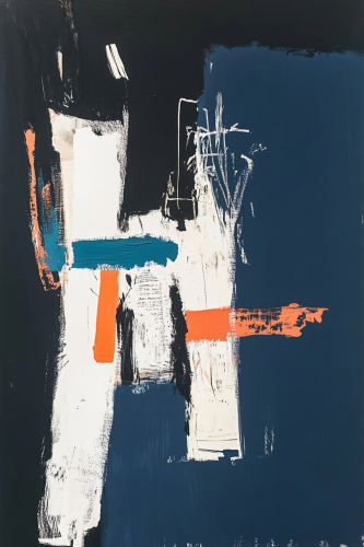 an abstract painting with white, blue and orange color palette, loose brush strokes, white paper with scribbles of shapes and text, collage cut out from magazine, 70s style, by Etel Adnan, loose brushstrokes, paint splashes, bold colors, dark navy background, low angle shot, high contrast, texture, movement, fluidity, elegance, minimalism, cubist influence, 35mm film grain. Navy and white background with pencil marks, orange paint splash, a variety of marks.