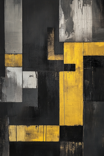 Generate an abstract painting that plays with contrast--both in color and texture. Use deep charcoal and black as the background, with bright metallic accents of gold and silver. The composition should feature overlapping geometric shapes that feel structured and architectural, contrasting with more fluid, organic forms. This piece should evoke the energy and sophistication of a bustling city. --ar 2:3