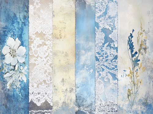 Beautiful, shabby chic, soft watercolor, vintage lace, blue and white junk journal paper collage. Clipart set of 4 images on different papers with a grunge background, in a shabby design. --ar 98:73