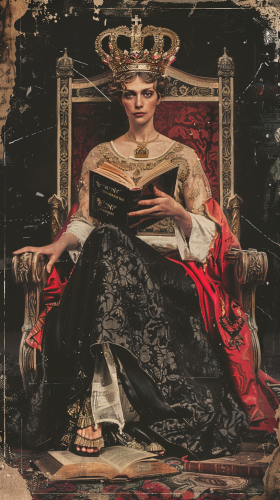 una carta del tarot vintage que muestra a una señora mayor de edad con el pelo largo y blanco sentada en un trono, lleva una corona en la cabeza, un vestido rojo y una túnica azul, en la mano izquierda lleva un cetro con una cruz y en la mano derecha un escudo. Estilo arte collage, fotorrealismo fantástico. --ar 9:16 --v 6.0
