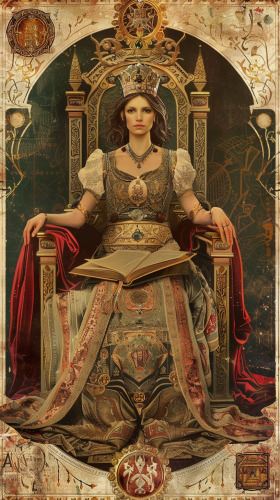 una carta del tarot vintage que representa a La Emperatriz, una señora mayor de edad con el pelo largo y blanco sentada en un trono, lleva una corona en la cabeza, un vestido rojo y una túnica azul, en la mano izquierda lleva un cetro con una cruz y en la mano derecha un escudo. Estilo arte collage, fotorrealismo fantástico. --ar 9:16 --v 6.0