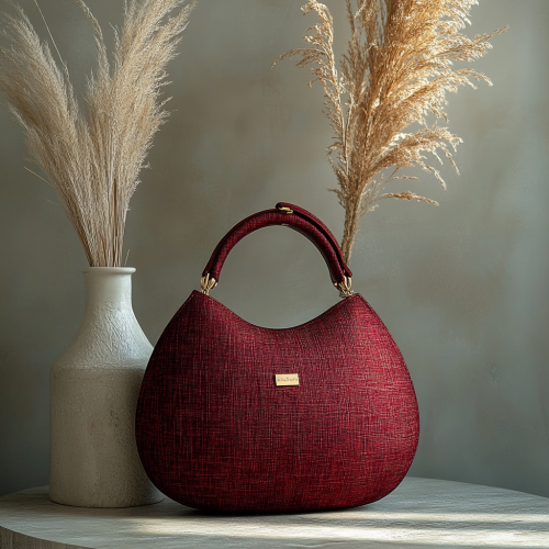 A luxurious and elegant handbag in a rich burgundy color with a structured half-moon shape, crafted from high-quality cotton material. It features small, refined gold hardware accents and a top handle, designed without any logos. The handbag has a soft texture typical of cotton, giving it a sophisticated yet casual look. Set against a clean, minimalist background to emphasize its stylish and timeless design, perfect for both day and night aesthetics. --s 750