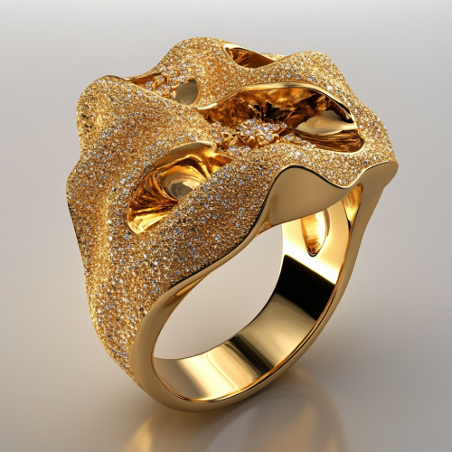 A high-definition image of a ring themed around abstract osmanthus, featuring minimalism and an irregular shape. It has a gold structure with a grainy texture, an abstract and layered design, and is set with diamonds. The piece embodies custom-made craftsmanship, naturalism, modernism, minimalism, and high-quality detail rendering.