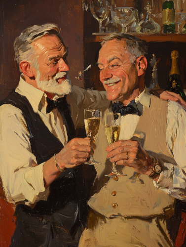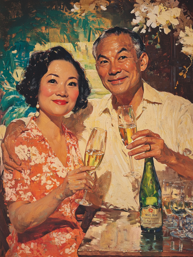 a vintage book cover asian senior couple drinking champagne, mystery in the style by Dean Cornwell and gregory manchess n c wyeth, 1930's realistic, --ar 3:4 --style raw --v 6.1 --quality 2 --stylize 50