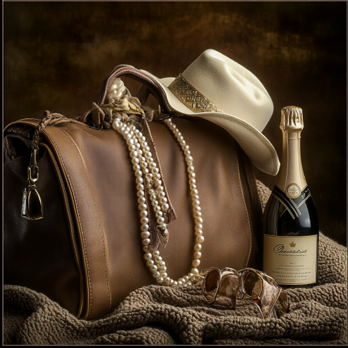 Create a vintage image that features a cream-colored pearl necklace, brown blanket, TAN COW GIRL HAT and a TAN/BROWN LUXURIOUS duffel bag AND A ELEGANT BOTTLE OF CHAMPAGNE. The overall color scheme is warm and earthy.