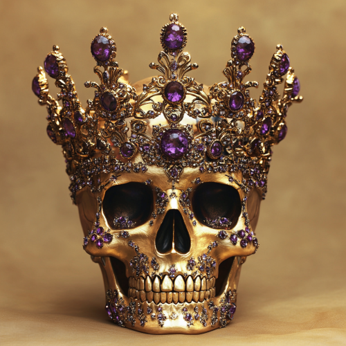 skull with golden crown with purple jewelery, photorealistic, gold background, real gold looking, crown covered of purple diamonds and gems, made only gold and purple colors