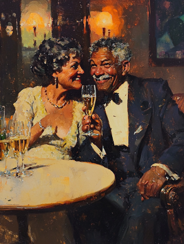 a vintage book cover black senior couple drinking champagne, mystery in the style by Dean Cornwell and gregory manchess n c wyeth, 1930's realistic, --ar 3:4 --style raw --v 6.1 --quality 2 --stylize 50