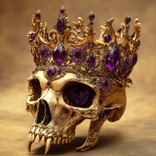 animal skull with golden crown with purple jewelery, photorealistic, gold background, real gold looking, crown covered of purple diamonds and gems, made only gold and purple colors
