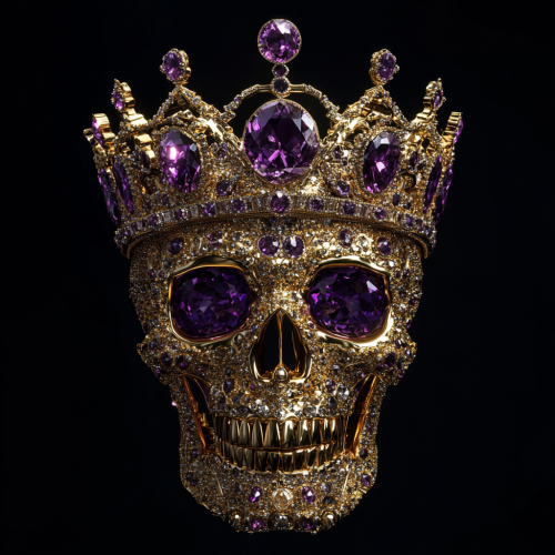 golden skull, made of lot of crown lewelery items, photorealistic, blackbacground, real gold looking, covered of purple diamonds and gems, only gold and purple colors