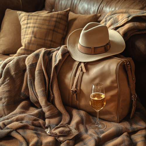 Create a vintage image that features a brown blanket, TAN COW GIRL HAT and a TAN duffel bag AND A ELEGANT GLASS OF CHAMPAGE. The overall color scheme is warm and earthy.