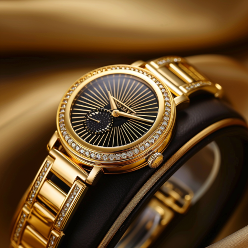 Your task is to craft a visually captivating design of a gold and diamond watch tailored for females, focusing on its front profile. Emphasize elegance and luxury in your design, incorporating elements of gold and diamonds to enhance its appeal. The watch's central dial should feature a sophisticated black-ish color, creating a refined contrast against the radiant diamonds and gleaming gold accents. Ensure the watch exudes femininity and grace, with a slim and sleek silhouette that complements the wearer's wrist beautifully. Set the watch against a backdrop of soft, muted colors, chosen to complement the richness of the gold and diamonds. Let the background evoke a sense of tranquility and sophistication, enhancing the overall allure of the watch without overwhelming its exquisite design. --v 6.0