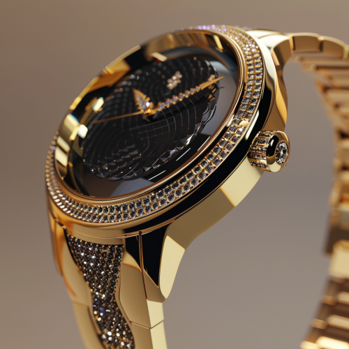 Your task is to design a stunning 3D model of a gold and diamond watch tailored for females, showcasing its front profile prominently. Craft the watch with a graceful and slim design, incorporating luxurious elements such as gold and diamonds. The watch's centerpiece should be a middle dial with a black-ish color, offering a sophisticated contrast against the sparkling diamonds and warm gold accents. Ensure that the watch exudes elegance and refinement, with delicate details and precise craftsmanship. Place the watch against a backdrop of soft, muted colors that complement the gold and diamonds, evoking a sense of serenity and sophistication. Consider incorporating subtle textures or patterns to enhance the visual appeal of the background, creating a captivating setting that enhances the beauty of the watch without overpowering it. --v 6.0