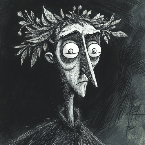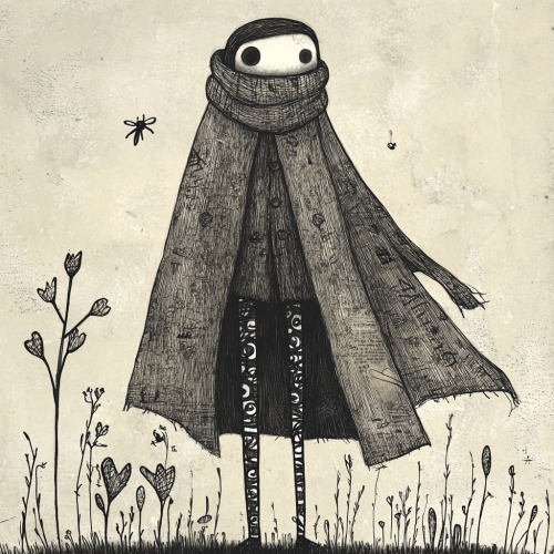 Create an illustration of a towering puppet figure with exaggerated features and a solemn expression, surrounded by an atmosphere of mystery and reverence. Use Edward Gorey's intricate cross-hatching technique to emphasize texture and shadow, particularly in the puppet's flowing robes and the delicate leaves or feathers adorning its head. Render the puppet’s face with a calm, almost detached expression, embodying Gorey’s unique, emotionless aesthetic. Keep the background minimal, hinting only at a stage or darkened theater space with subtle lighting effects. Include symbolic elements like softly drawn birds or faint shadow patterns to add an air of mystique. The scene should evoke a sense of surreal grandeur and quiet contemplation, with symbolic motifs enhancing the puppet’s otherworldly presence