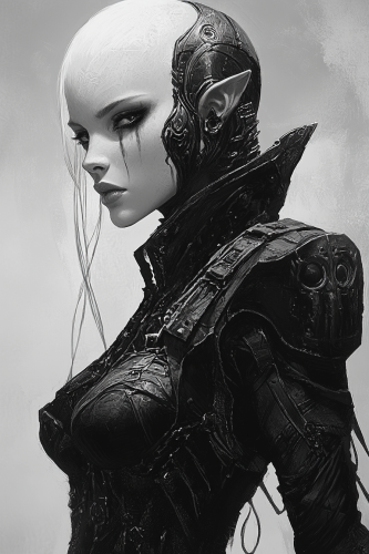 : Photo Character design sinful full-tattooed-body Dark-Elf warrior woman intricate Hi-Tech design dramatic field depth Moebius Sci-Fi Art Style Grimdark gritty texture --ar 2:3 --v 6.1