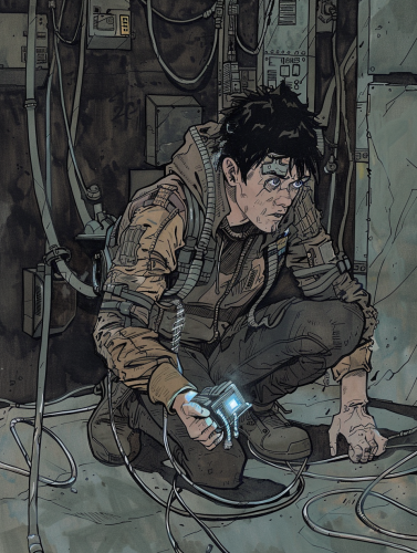 illustration, ink on paper, of a 80's sci fi occult trading card of a young man, crouched holding an electronic devise with many cables. he is wearing a brown rain jacet, and has metal implant on his face, he is black haired and has an expresion that reflects excitement. Its obsidian-like glow reflects its excitement and strength, with a backdrop of futuristic computer mainframe. The scene conveys the man resilience and its connection to the cyberpunk lifestyle in the art style of Graham Ingels, Mike Mignola, centered, psychedelic colors, vintage, --ar 3:4 --v 6.0 --s 75