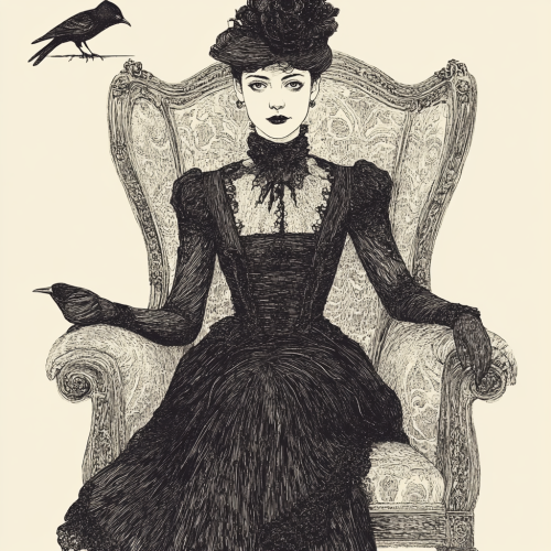 Create an illustration in the style of Edward Gorey, featuring a young woman seated elegantly in an ornate armchair, dressed in a vintage-inspired outfit with a theatrical touch. Use intricate cross-hatching to emphasize the texture of her outfit and the elaborate upholstery of the chair, adding depth through detailed shading. The woman should have a minimalist expression, with an air of detachment and mystery, characteristic of Gorey's enigmatic characters. Place her in a minimalist background, allowing empty space to enhance the atmosphere of solitude. Include subtle symbolic elements, such as a small black bird perched nearby or a vintage clock on the wall, hinting at themes of isolation and timeless elegance.
